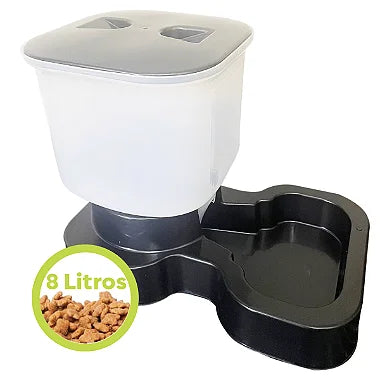 O Comedouro Automático possui um reservatório com capacidade para comportar até 8 litros de ração, proporcionando uma quantidade generosa para o seu pet ao longo do dia.